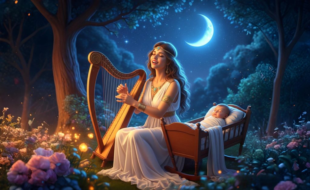 Ilustração de uma mãe tocando harpa sob a luz da lua, representando as músicas suaves de ninar Lulamor com voz feminina para acalmar bebês.